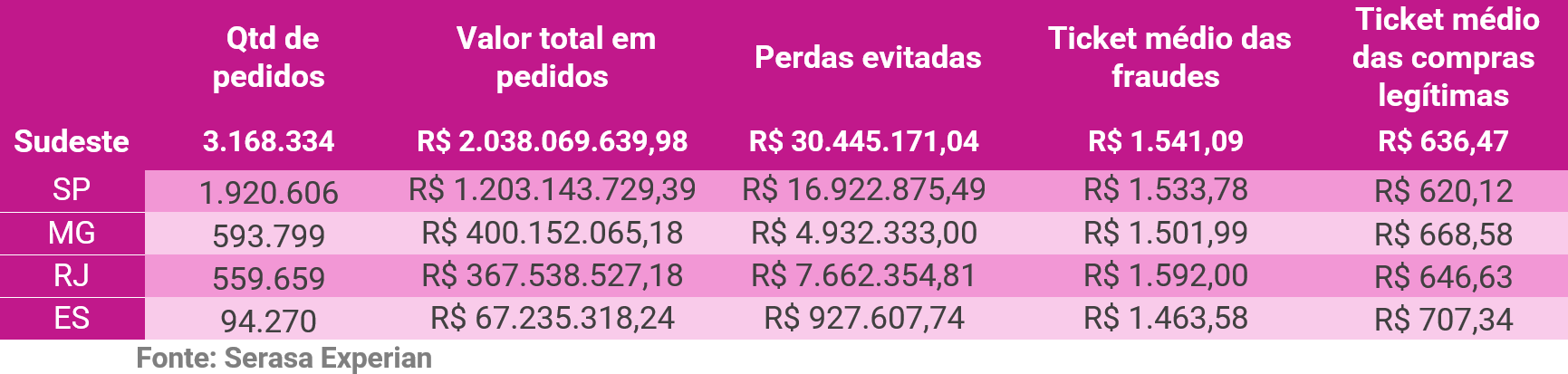 Ainda na análise do período da Black Friday de 2024 (entre 28 de novembro e 1º de dezembro), o Sudeste respondeu pela maior fatia do e-commerce nacional, com 3,1 milhões de compras, das quais 0,6% foram bloqueadas antes de gerar prejuízo, totalizando R$ 30,4 milhões em perdas prevenidas. Já o Norte, com 130 mil pedidos, apresentou a maior taxa proporcional de tentativas (1,04%), o que representa R$ 2 milhões poupados. Confira, na tabela abaixo, o panorama completo das fraudes evitadas por região: