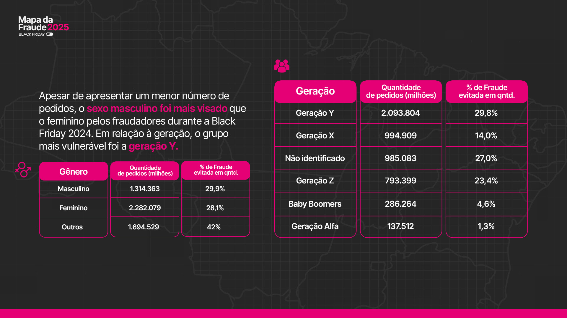 Durante a Black Friday de 2024, os consumidores da Geração Y lideraram o volume de compras online, com mais de 2 milhões de transações. Os Millenials também foram o principal alvo das tentativas de fraude, concentrando quase 30% dos ataques. Em um recorte de gênero, embora as mulheres tenham realizado mais compras no período, a taxa de tentativas de fraude foi mais elevada entre os homens. Os dados são da Serasa Experian, primeira e maior datatech do Brasil, líder em identidade digital e prevenção a fraudes. Confira, no gráfico abaixo, o comparativo completo por gênero e faixa etária: