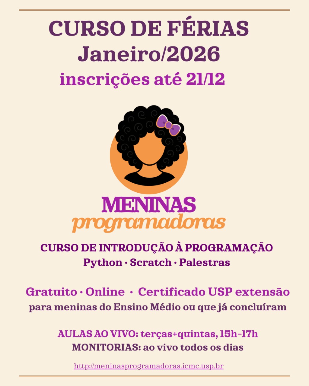Ao final do curso, as participantes que cumprirem os requisitos receberão um certificado de extensão da USP, com carga horária de 40 horas. Informações completas sobre o curso estão disponíveis em https://icmc.usp.br/e/zn21x, e as inscrições podem ser realizadas pelo sistema Apolo da USP, por meio deste link: https://icmc.usp.br/e/ypqpx.