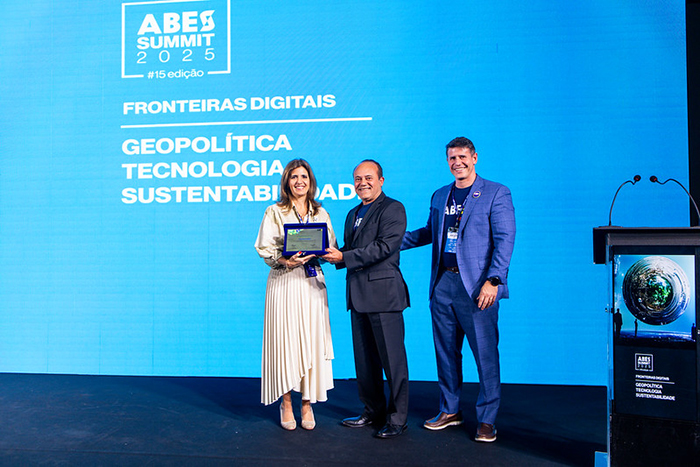 Rodolfo Fücher, conselheiro da ABES; PAULA BELLIZIA, CEO da Microsoft Brasil, e Francisco Camargo, presidente da ABES