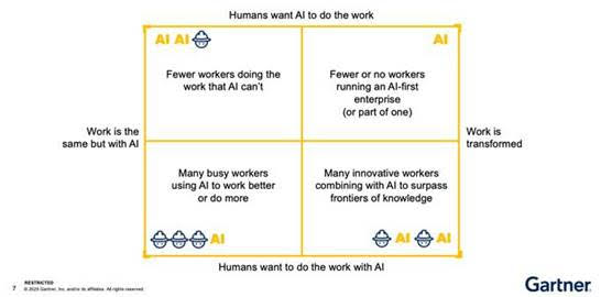 O Gartner apresenta quatro cenários que ilustram como as estratégias que priorizam as pessoas e as que priorizam a Inteligência Artificial podem moldar o impacto da IA nos empregos e nas organizações.